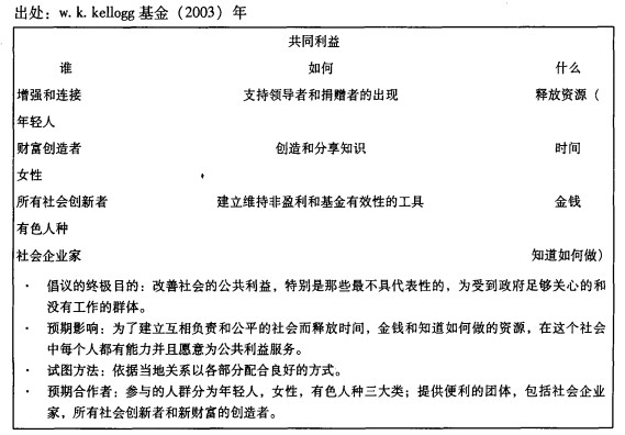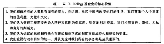 本次倡议具有以下重要特征。第一,它是一个基于价值的项目。倡议的最根本的指导思想是加强和联系慈善和自愿者领域领导者的关系,并不是基于任何科学理论或实例验证的。相反,它来自于W. K. Kellogg基金会的核心价值(如框1),除此之外,还强调倡议去帮助别人和自己。虽然这些价值观能被社会充分接受,但是是否需要或者如何去进行主体项目干预并不是很清楚。