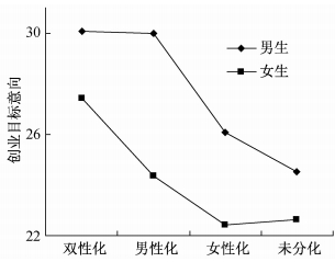4.对于创业目标意向来讲,性别和性别角色类型之间存在显著的交互作用,具体来讲,对于男生来说,创业目标意向在双性化与男性化被试之间不存在显著差异,但男性化被试的创业目标意向显著高于女性化被试;对于女生来说,创业目标意向在男性化、女性化和未分化被试之间不存在显著差异,但是双性化被试的创业目标意向显著高于男性化被试。