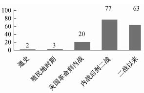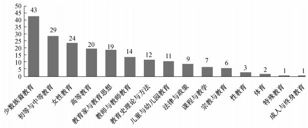 从上图可以看出,美国教育史学者尤为关注内战之后的教育问题。究其原因,一方面在于内战之后美国教育的现代化进程加速,各个层次的教育都发生了结构性的变革,各种矛盾和冲突也逐渐凸显。另一方面的原因在于美国教育史研究的现实性特征,学者们普遍重视梳理和追问与当下教育问题有关的历史线索,希望能够从历史中探寻解决之道。