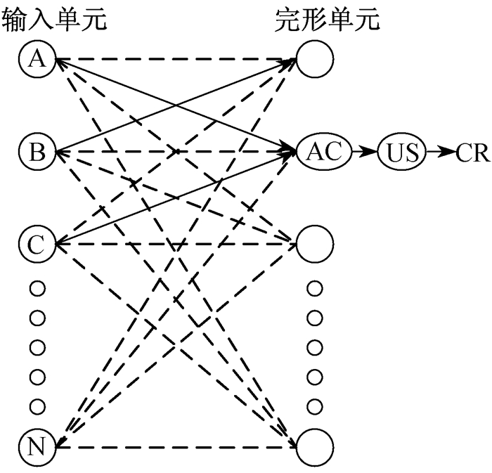 (二) 完形理论完形理论认为当主体面临任何形式的刺激时都会激活一个输入网络(input network),该网络包括一层输入单元,这些输入单元要么处于激活水平要么处于睡眠状态,每个输入单元都同大量的完形单元(configural units)相联结。例如:图 1表示没有任何学习发生的状态,输入单元和完形单元之间的联结强度都为0,因此没有激活任何完形单元(虚线表示无效联结,实线表示有效联结);图 2是给主体呈现刺激A和刺激C时,输入单元和完形单元之间的联结情况。如果复合刺激A和C总是与无条件刺激配对出现,那么复合刺激AC的完形单元就会与无条件刺激US建立联结。当接下来呈现复合刺激AC时,会激活复合刺激AC的完形单元,从而激活无条件刺激,导致出现条件反应CR。条件反应的强度取决于完形单元AC的激活程度以及条件刺激AC和无条件刺激的联结强度。