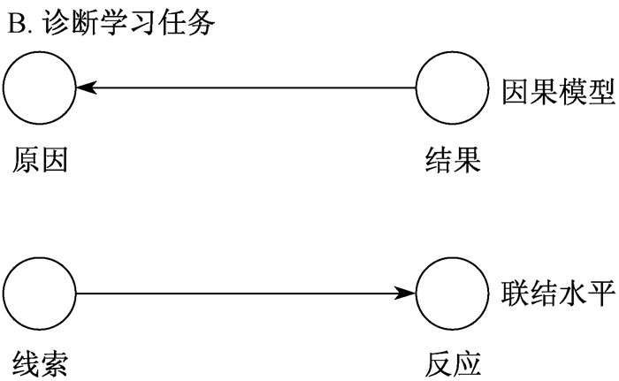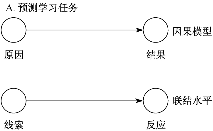 (一) 因果模型理论(causal model theory, CMT)Waldmann和Holyoak提出:联结主义学习理论认为事件之间的因果关系仅仅与时间顺序有关,是形成线索和结果之间的联结,先发生的事件被当作线索而后发生的事件被当作结果。在联结学习中线索和输出结果之间不存在必然的因果联系,线索既可以做原因也可以做结果。而因果模型理论认为事件之间因果关系的形成依赖于现实生活中事件所扮演的因果角色。现实生活中的线索指的是在因果关系中扮演原因角色且导致结果产生的事件④。因此,因果模型理论强调因果关系学习中的方向性,人们对学习中因果关系的方向性也非常敏感,并且人们由于对因果关系中不同方向性的感知会导致预测学习(predictive learning)和诊断学习(diagnostic learning)中的阻碍效应不同。