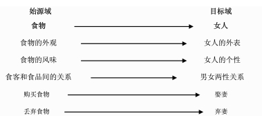 “女人是食物”的隐喻实际上还蕴含着其他一些子隐喻,如“娶妻是购买食物”,“弃妻是丢弃食物”。但是这些隐喻并未在张爱玲的小说中明确体现,因此不再赘述。所有关于“女人是食物”的隐喻所构成的隐喻体系总结如下: