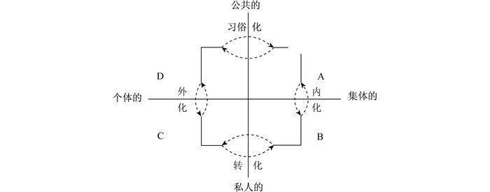 根据维果茨基有关学习的理论,哲学家哈瑞(Harré)提出了一个被西方学者广泛引用的学习环路模型(如图 1,有改动)③,即著名的“维果茨基空间”。在这种模型中,象限A和D代表学习环路中的“公共”层,即维果茨基所指的心理间层面; 象限B和C是“私人”层,即维果茨基所指的心理内部层面。与他人一起工作出现在象限A中,此时任务和目标在社会和集体层面上得以讨论;当个体试图通过与已有经验的结合来重构和理解所学任务时,它就开始由象限A过渡到象限B中(即“内化”);当这种理解与个人情境进一步结合而走向新的理解时,它就由象限B过渡到象限C(即“转化”);新的理解通过实践“外化”出来时,学习过程就由象限C进入了D,从而返回到“公共”层面。进入“公共”层面的新的实践形态,如果有效,则被他人所仿效,从而实现在某个群体(如玩伴、学伴或同事等)中的“习俗化”。通过这个“内化-转化-外化-习俗化”的过程,个体不仅吸收了集体或文化中成分,促进了自己的成长,也最终通过自己成果的外化和习俗化,反过来促进了集体的成长,并由此进入新一轮学习之中。