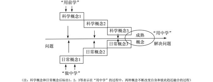 (一) “用”中学:教师成熟概念的生成机制既然成熟概念是有效地指导自己实践的个人理论,教师的发展就有赖于其成熟概念的形成。根据维果茨基的观点,成熟概念形成于科学概念与日常概念相互融合的时候。这里的“概念”并不单指对于某一术语的定义,而是指有关某事物的理解、观念和态度。所谓“科学概念”,指在教学情境中习得的概念,它通常是一个统一的、有逻辑层次的系统。所谓“日常概念”,又称为“自发概念”,指在没有明显的教学情境下获得的概念,它来自直接的、社会性的实践活动,与正式的知识系统的教学情境不同。⑥通常情况下,这两种概念并不会自动地融合,而是完全可以并列地存在于个体中。比如,在课程改革的教师培训结束后,有些教师可以在相应的书面考试中获得高分,在与他人交谈时也可以大谈新课程理念而不走调。但是,回到自己的课堂实践时,其教学行为可能依然如故。考试中的高分表明他们已经获得了一些科学概念,而实践中的旧态则表明他们的日常概念在控制其教学行为时并没有受其科学概念的影响。