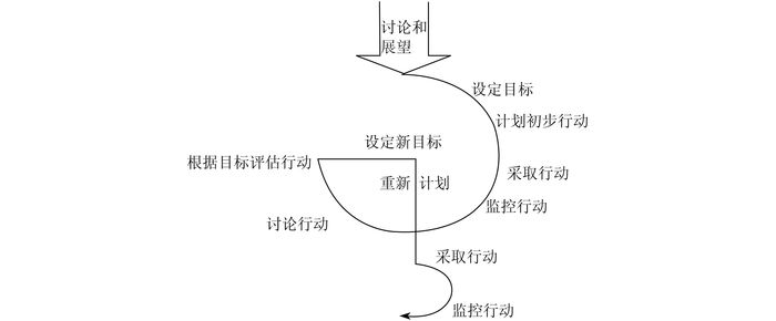 根据这个行动研究的螺旋模式图,我们可以将实践模型的反复建构过程划分为如下五个阶段:第一,计划模型。在这一阶段,教师会通过与他们一起讨论和展望来“设计目标”和“计划初步行动”,即形成初步的实践模型。由于这一模型还只是根据所内化的新理念而初步设计的,所以有待验证。第二,试行模型。在这一阶段,教师会根据这个行动方案“采取行动”,并密切地“监控行动”。第三,反思模型。通过与他人一起“讨论行动”和“根据目标评估行动”,调整指导实践的理念。第四,重建模型。根据新的理念“设定新目标”和“重新计划”,制定新的行为模型。第五,重试模型。重新“采取行动”,尝试实行新的行为模型,并“监控行动”。事实上,到此为止,该模型的建构已经进入了新一轮更高阶段的循环之中。