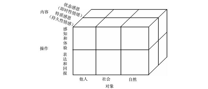 从我国独特的文化背景出发,参考、吸纳现有感恩理论的合理内容,移植、借鉴智力与情绪智力三维结构理论的框架结构,本研究从理论和操作两个层面对感恩进行了界定。在理论层面,把感恩定义为个体在认识到施恩者所给予自己的恩惠或帮助基础上产生的一种感激并力图有所回报的情感特质,是知、情、意、行的有机统一,是一种积极的、具有社会道德意义的人格特质;提出了感恩三维结构理论,该理论模型由“对象(他人、社会、自然)”、“内容(状态感恩<即时性情绪>、特质感恩<持久性情感>)”和“操作(感知和体验、表达和回报)”三个维度构成,可以细分出3×2×2=12种基本感恩类型(因素),这12种感恩类型(因素)既可视为一个整体,也可看做12个相对独立的部分(见图 1)。在操作层面,感恩作为一种情感特质是个体即时性或持久性地感知和体验、表达和回报他人、社会或自然恩惠。该理论模型“内容”维度中所谓的“特质感恩”,是与“状态感恩”相对而言的,是个体持久性地感知和体验、表达和回报他人、社会及自然恩惠,是感恩的基本内容之一。鉴于状态感恩的情境性、特异性,作为系列研究的第一步,这里暂且仅针对稳定的特质感恩编制测评工具,即根据理论构想的感恩三维结构理论中的“对象”和“操作”两个维度(组合成6个因素或类型)开发青少年感恩量表。