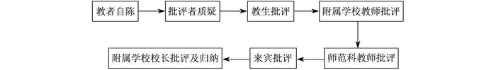 当时,有关试教的讨论会、批评会主要有每周讨论会和批评试教会两种。⑨每周讨论会主要是由附属小学各级的级任教师召集师范生,在每星期中特定一天的课后举行。每周讨论会一般遵循这样的顺序:在师范生进行切磋交流的基础上,担任教师主要从教学实践的角度,用“诚恳的态度、切实的见解”来点评他们教学的优缺点;接下来由附属学校校长进行点评,因为附属学校校长一般都兼授师范生的教学法功课,所以校长参与每周讨论会,可以有效沟通教育理论和教育实践。其大致流程如图 1所示: