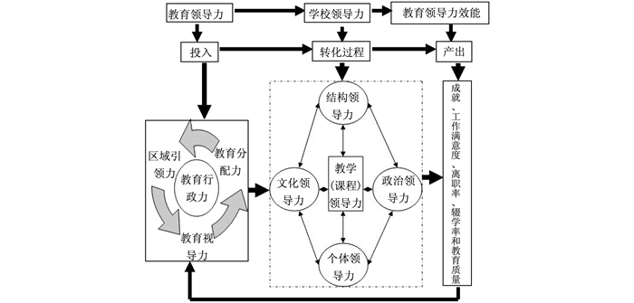 根据教育领导力的广义和狭义之分, 为了便于学术话语的统一, 教育领导力应指学校外部的领导力;而学校内部的领导力应称其为学校领导力。教育领导力可以看作是学校领导力的宏观环境, 是学校领导力实现作用的资源投入来源。通过教育领导力的投入和学校领导力的转化, 产出教育领导力的成效, 成效包括成就、工作满意度、离职、辍学率和教育质量。这样, 教育领导力投入、教育领导力过程(学校)和教育领导力产出(教育领导力与学校领导力相互作用产生的成效), 统称为教育领导力系统, 该系统所有子系统及其内部元素排列组合形成了教育领导力研究领域(如下图 1所示)。