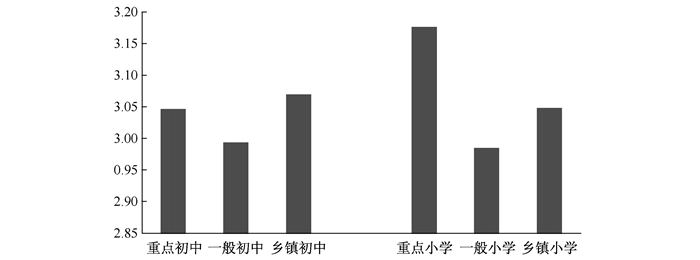 “课外补习”情况。课外补习包括参加补习班和学校布置以外的作业。总体M=2.85,SD=1.24,说明课外补习现象不算普遍。三类学校相比,“课外补习”时间重点学校>一般学校>乡镇学校, 这也与学习水平的要求和升学期望相对应。具体选项的选择结果是:28.7%的学生家长会给孩子布置额外的作业,33.6%的学生经常参加课外辅导班,在参加课外辅导班的学生中有28.2%表示,辅导班的学习内容与大多学校所教内容重复。可见,儿童的课业负担一定程度来自家庭。