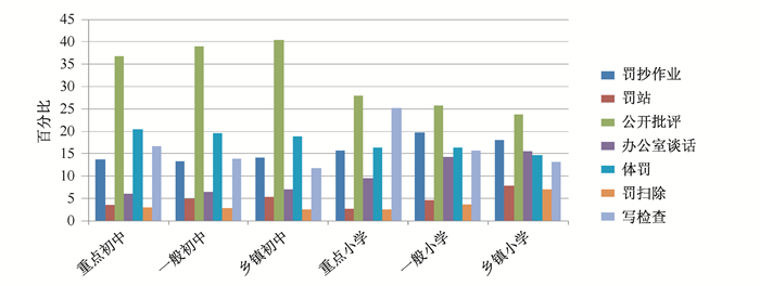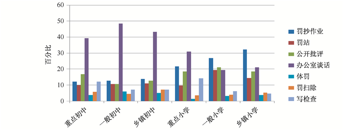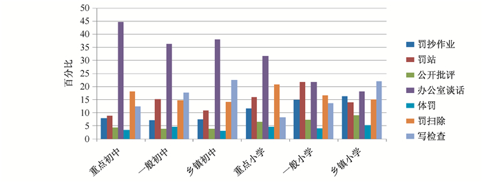 图 9呈现了三类中小学学生可接受的处罚方式选择。初中生基本集中于选择“办公室谈话”,小学生选择接受“罚站”、“抄作业”、“罚扫除”都有一定的比例。结合看图 8与图 9,“罚站”是一般性学校的常用方式,“罚抄作业”是乡镇小学常用的处罚方式。一般性的小学选择接受“罚站”的比例高,乡镇小学选择接受“罚抄作业”的比例高于其他两类学校。由此看来,常用简单化处罚方式会产生脱敏作用。