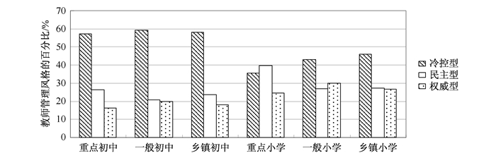 各类教师风格比例是:“冷控型”45.3%,“民主型”27.5%,“权威型”22.6%。较差的“冷控型”风格居首位。从图 11可知,初中“冷控型”占绝对优势。重点小学“民主型”较高。