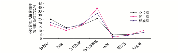 从图 12可见,民主型、权威型选择较高的,多以“办公室谈话”为处罚方式,“体罚”、“罚站”、“罚扫除”较低。