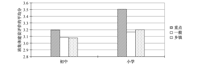 问卷从参与集体、小干部工作、班级文化几方面调查班集体建设。调查结果是:M=3.23,SD=0.83。具体选项比例为:“经常开展集体活动”45.9%,“干部是由老师指定的”44.5%;“做干部的主要任务是帮老师管同学”43.6%,“没有机会担任干部”25.1%。这些数据表明:尚未形成广泛参与的集体建设状态。从图 13可知,三类学校差距较大,重点学校的班集体建设状况较好,重点小学更明显,初中的集体建设状况普遍薄弱。