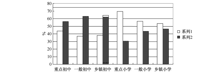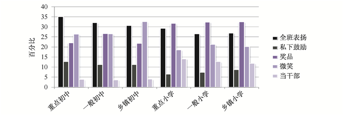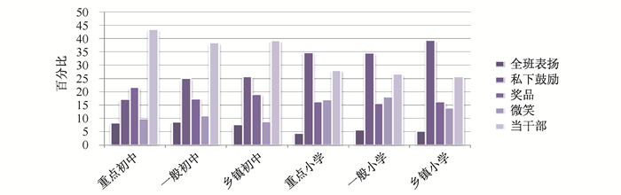 要求学生在选项中根据教师最常用的表扬方式进行选择,“奖品”是在组织集体活动时出现的表扬方式,“当小干部”是教师面对群体的独断行为,“私下鼓励”和“微笑”是师生个别接触的方式,需要教师对学生细致观察。调查结果依次是:“全班表扬”73.4%,“微笑”13.4%,“奖品”6.4%,“私下鼓励”5.9%,“当小干部”1.0%。三类中小学的奖励方式相似(图表略),选择比例最高的均为“全班表扬”,其他几类表扬方式选择都低。反映了教师表扬鼓励的方式比较单调。