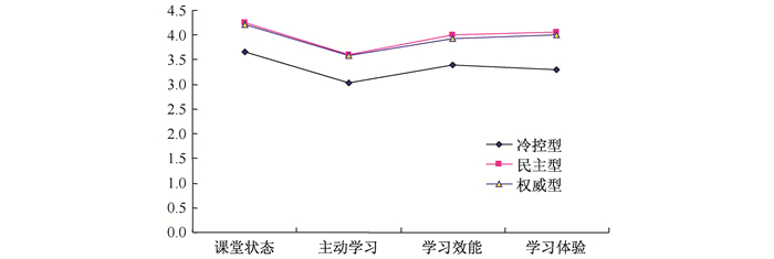 问卷从亲和性、专权性和对抗性三个维度设计问题,了解教师的日常教育态度和方式,在此基础上聚类分析,结果显示可聚为三类。依三维度分数特征(见表 3),对聚类结果命名。第一类,“亲和性”低、“对抗性”较高,“专权性”中等,命名为“冷控型”;第二类,“亲和性”较高,“专权性”较低、“对抗性”较低,命名为“民主型”;第三类,“亲和性”较高、“专权性”较高,“对抗性”低,命名为“权威型”。“冷控型”教师对学生较严厉,师生关系差;“权威型”教师既跟学生亲近,也较严厉和专断;“民主型”的教师能够听从学生意见,不专断,但跟学生的亲近关系不如“权威型”。