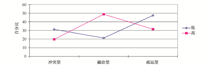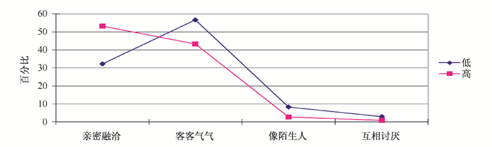 将班集体建设评价大于3分的作为高分组,小于等于3分的作为低分组。班集体建设类别与同伴交往类别的Phi相关系数为0.285(P < 0.001)。班集体建设评价类别与师生关系类别的Phi相关系数为0.234(P < 0.001)。图 16可见,集体建设高分组学生评价师生关系亲密融洽的比例明显高于班级建设较弱环境中的学生。从图 17中可见,“班集体建设”高分组“融洽型”同伴关系比例较高、“冲突型”、“疏远型”的同伴关系比例较低;“班集体建设”低得分与之相反。