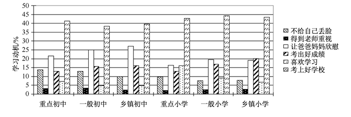 三类学校学习动机调查结果见图 2。小学生“考上好学校”的选择居绝对优势,且高于初中。相对而言,“喜欢学习”的选择小学高于初中,重点学校比其他学校高。此外可见,初中生更注重面子,选择“不给自己丢脸”高于小学。初中选择“让爸爸妈妈欣慰”高于小学,而且乡镇初中选择率最高。随年龄增大,父母心愿的动力增强,乡镇学生更明显。