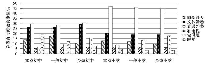 希望有更多时间来做的事情,反映了喜欢做而无暇做的,也反映了时间紧张做不了。问卷提供了六个选项要求回答希望有时间做什么,选择结果依次是:“看课外书”40.0%、“文体活动”22.2%、“聊天”12.4%、“做习题”12.2%、“睡觉”6.9%、“看电视”6.3%。在所有选项里,“看课外书”的选择远高于其他选项。这既反映了学生们的普遍需要,也反映了满足此需要的条件限制。