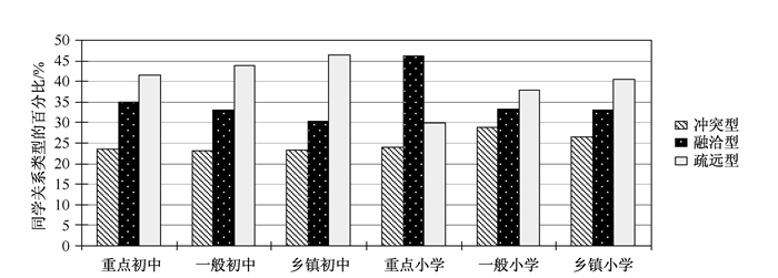 三类中小学同伴关系类型分布见图 4。从图可见,初中生“疏远型”高于小学,乡镇学校“疏远型”高于其他学校,重点小学“融洽型”明显高。