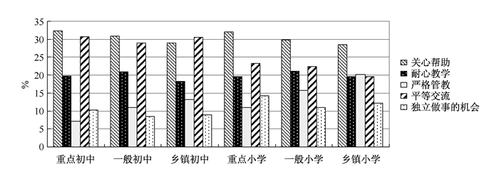 三类学校的选择比例见图 5。初中生希望“平等交流”的选择明显高于小学生,这是成长的表现。乡镇学校较特别,小学希望“平等交流”的选择低于其他学校,初中的选择高于其他学校。乡镇学生成长的变化较城市学校学生明显。希望老师“严格管教”的选择小学高于初中,乡镇高于其他学校。反映了乡镇学生和小学生对传统教育观点有较强的认同。希望“独立做事的机会”的选择值得注意,重点学校学生选择较高,但初中生的选择却低于小学,与成长规律不符,反映了独立做事经验的欠缺。