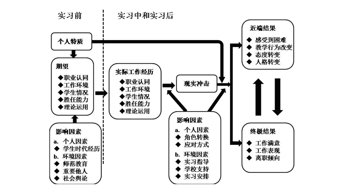 (二) “现实冲击”的结果模型中实习教师“现实冲击”的结果变量包含两个层次:近端结果和终极结果。近端结果主要可以概括为四个方面的内容:(1)感受到困难。主要包括身体和心理上的不适。调查资料显示,实习教师在面临“现实冲击”时,通常会感到压抑、迷茫和害怕(Grant, 1992),继而导致身心疲劳,甚至出现饮食和睡眠问题(Caries, Almeida, Martins, 2010)。(2)教学行为的改变。主要指迫于外部压力而产生违背自身信念的教学行为。有调查显示,虽然94%的新教师都曾尝试使用更加民主的教学方式,但其中91%的人最后都因各种困难而改变了他们的教学方式(Veenman, 1984)。(3)态度的转变。主要指教学观念或信念的转变。一项研究表明,实习教师最初“以学生为中心”的教学观念在受到现实教学情境的冲击后会逐渐消退,并最终融合到“以教师为中心”的教学现实中(王长江, 任新成, 2012)。(4)人格的改变。主要指情绪稳定性以及自我概念方面的改变。已有研究表明,教育实习过程中,由于“现实冲击”的影响,一些实习教师会产生情绪调节方面的问题(Grant, 1992),变得缺乏自尊和自信(Cole & Knowles, 1993),甚至可能丧失自我同一性(Brown, 2006)。终极结果则主要包含三个方面:工作满意度、工作表现和离职倾向。已有研究证实,如果实习教师没能处理好“现实冲击”及其所导致的近端结果,则会感受到较低的工作满意度和消极的实习体验(陈海凡, 2003),并且在教学和班级管理上遇到更多挫折(吕立杰, 郑晓宇, 2008)。而“现实冲击”导致的幻灭感和失落感一旦达到一定程度,甚至会导致实习(初任)教师放弃教师职业(Veenman, 1984; 姚红玉, 2005)。