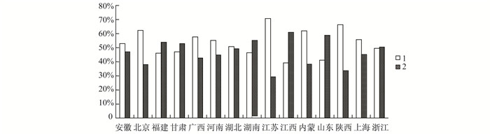 根据两类人数比例差,将15个样组归为四个水平:A水平,较适宜型超过适宜差型20%,这些区域是:江苏(CZ)、陕西(XA)、内蒙、北京。B水平,较适宜型超过适宜差型10-20%;这些区域样组是:上海、广西、河南。C,两种类型差距不到5%;这些区域样组是:安徽(HF)、湖北(WH)、浙江(HZ)、甘肃。D,适宜差型高出较适宜型10-20%,这些区域是:江西(GA)、山东、福建(XM)、湖南(XH)。从图 1可知,东、中、西部没有显示共同的区域特征,各水平分布也未见与传统和现代文化区域匹配。同样是一个地区,有不同的水平; 同样一个水平,包括现代化较强和传统较强的区域。这表明,不存在板块式的区域文化影响。这也许是文化演化动态特征的一种表现,需作具体分析。