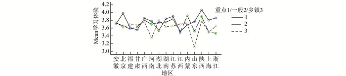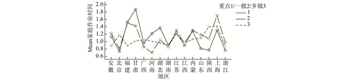 图 10呈现了各区域三类学校样组家庭作业的平均时间,大多重点学校的家庭作业时间低于其他两类学校。甘肃、河南、湖北区域组不同,重点学校作业时间多于其他学校。这些重点学校应试压力大、教学效率不高。