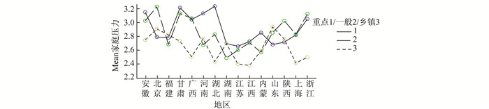 问卷调查了家长对学生学习的压力。较低的家长压力既可能是开放的教育态度的反映,也与区域经济条件有关。经济条件差,升学会成为改变生活状态的重要路径。除了对区域经济状况有大致的了解,问卷调查了拥有手机的情况,从这一侧面获得学生家庭经济条件信息。手机总体拥有率为45.6%,拥有率最低的三个区域组是:江西19.7%、安徽31.9%、甘肃37.5%。图 11呈现了各区域组三类学校家长压力的调查结果。甘肃、安徽样组三类学校的家庭压力都较高。甘肃样组高家长压力与高学习时间匹配,反映了家庭与学校压力一致。江西样组三类学校的“家庭压力”均较低。从图 11可见,乡镇学校的家庭压力普遍较低,但山东的乡镇学校较高,此外,北京、河南、湖南等地的乡镇学校的“家长压力”也明显高于江浙沪等地的乡镇学校。这一现象既受区域经济条件差异的影响,可能还与区域文化传统差异有关。传统文化浓郁的背景下的家长对孩子读书升学的要求更为强烈。