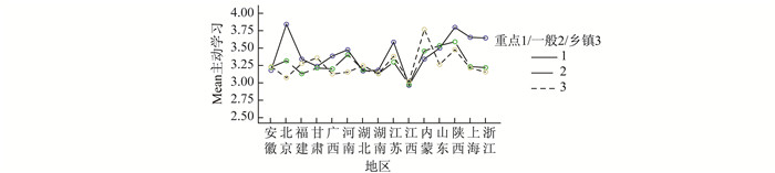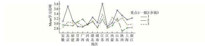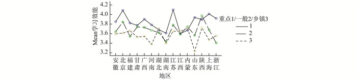 已有研究发现,对“学习”的理解存在着文化差异(Li, 2005; Witherington, 2007)。特定的文化背景会影响儿童对学习及学习活动的理解。图 12呈现了各区三类学校样组学习概念均分。大多数重点学校的“学习范畴概念”得分较其他学校高,多数一般性学校得分低于其他两类学校。这说明,重点学校学习内涵的理解较丰富,城市一般性学校对学习概念的理解较狭隘。这在一定程度上反映了学校学习活动的丰富性或简单应试性。学习概念区域组得分与上述结果也有类似的特点:甘肃的重点学校样组低于其他两类学校,内蒙乡镇学校样组得分高于其他两类学校。