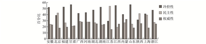 图 2呈现了各区样组数据反映的三类教师管理风格比例。①从图 2可见,冷控型高比例居多,民主型居优的只有江苏、陕西、北京三个区域样组,内蒙的权威型比例最高。由聚类数据可知,冷控型在亲和性指标的得分低,权威型在亲和性指标的得分比民主型还要高。因此,内蒙样组的教师保留着传统文化的权威性,同时师生关系较密切。冷控型居多反映了教育改革过程的不适应。忽视儿童主动性的惯性工作模式,教育新理念停留于话语表层,加之多种因素形成的强烈竞争压力,成长中的学生又会不断冒出问题。疲于应对情况下,简单化处理和消极退避成为最便利的解决方式。