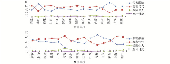 各学校所处区域具有不同的文化特征,每一区域样组中的三类学校代表着特定的学校文化,师生关系是焦点。透过师生关系特征比较,可折射出学校文化演化的特征。图 3呈现了十五个区域样组重点学校和乡镇学校学生的师生关系评价。从图 3可见,大多数区域的重点学校以“客客气气”描述师生关系的比例较高,师生关系较疏远。陕西、北京、上海、浙江和山东的重点学校描述师生关系为“亲密融洽”的呈现较高比例,陕西最高。乡镇学校的情况则有所不同,内蒙、江西、山东、陕西和安徽选择“亲密融洽”的高于“客客气气”。尤其是内蒙的农村学校,“亲密融洽”的比例最高。