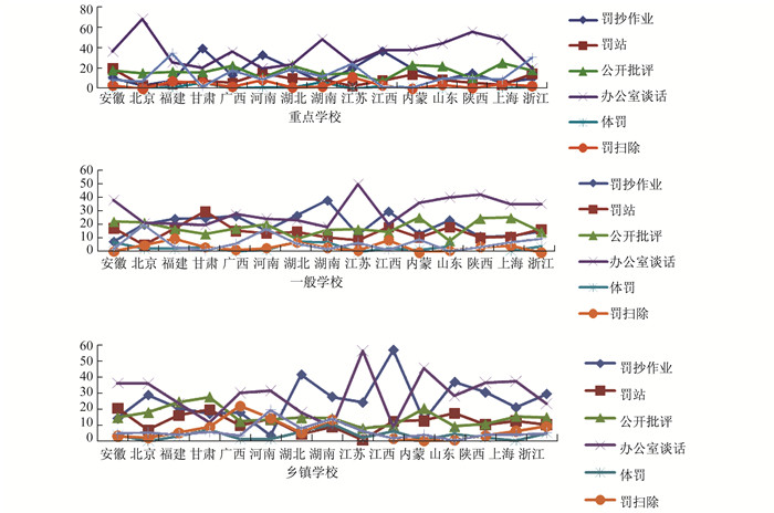 图 9呈现了各区域组三类学校教师常用处罚方式的调查结果。江苏、上海样组三类学校罚抄作业和罚站的比例都较低,多数重点学校简单化的处罚方式低于其他两类学校。但是,内蒙重点学校样组罚抄作业和罚站的比例高于其他两类学校,甘肃、江西、河南的重点学校样组罚抄作业的比例也较高。这一方面的结果进一步表明,较发达区域的学校教师简单化处理也较少,示范性学校简单化处理较少。在传统文化较强区域的重点学校情况不同,简单化处理反而更高。