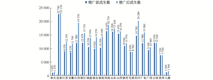 清代各省武生总额,咸、同捐输增广前为22075名(不含八旗驻防等中额无定者)。武生学额最多之三省,依次为直隶(2274)、河南(1643)、山东(1620);最少三名为奉天(105)、贵州(752)、安徽(853)。咸、同捐输增广武生定额4687名,武生定额达26752名,增广比例为21. 23%。此时学额前三省变为直隶(2313)、四川(2028)、江西(1957),捐输广额最多之三省,依次为江西(759)、四川(554)、湖北(432),得益于此,江西及四川两省学额均得入前三名。下文分析清代武生人数及分布,再以图表直观体现其变化。