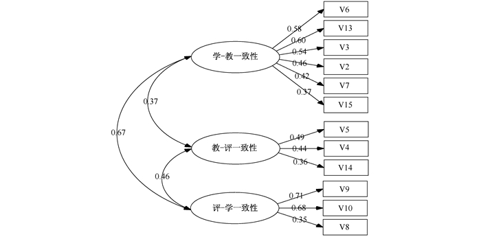 (二) 教-学-评一致性三因素结构的有效性为了验证教-学-评三因素理论模型的有效性,通过运用SPSS软件,对收集的数据进行项目分析和探索性因素分析。结果显示,虽然之前的15个题项,有3个题项在项目分析和探索性因素分析中由于因子负荷较低或者单独成一个因子等原因被删除掉了,但是这并没有影响最终研究结果。在探索性因素分析中,上述教-学-评一致性的三因素指标均有出现,并且这三个维度出现的题项内容与之前关于教-学-评一致性三个维度的理论分析的内容比较切合,因此这从实证的角度初步检验了教-学-评一致性的三因素结构。同时本研究还对探索性因素分析的结果进行了内部一致性信度检验,结果发现,问卷的Crombach内部一致性α系数为0.76,各维度的内部一致性α系数都大于0.69,这表明该问卷具有较高的内部一致性信度。同时,这也证明了,将教-学-评一致性划分为三因素结构是可靠的。