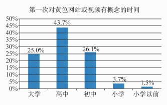 2. 浏览网络不良信息网络不良信息是指在网络中通过图片、文字、声音、影像、游戏等形式传播的,以血腥暴力、淫秽色情、反道德伦理等为主要内容的网络信息。我们的调查发现,大学生对网络不良信息并不陌生,也清楚这种行为所带来的危害(见图 3);75.0%的大学生在大学之前“第一次对黄色网站或者视频有概念”(见图 4)。在频繁上网的过程中,还存在被动浏览不良信息的现象,42.1%的大学生明确表示“上网会受色情或暴力信息的影响”;60.1%的大学生表示在使用手机上网的过程中或多或少地被动浏览过黄色信息。另外,61.6%的大学生明确表示自己“从未”“浏览过黄色网站”,其比例远远高于他们认为身边的同学或朋友“从未”“浏览过黄色网站”的比例(22.8%)。