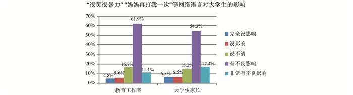 网络语言是信息时代的产物,它通常以标新立异、打破常规来吸引着众多网民的追随使用。但是,网络语言对传统语用规范的异化严重冲击了我国传统文化体系的严谨和传统文化的传承;同时,它也对大学生的语言规范产生不良的影响,以致73.0%的教育工作者和71.7%的大学生家长明确表示“很黄很暴力”、“妈妈再打我一次”等网络语言对大学生已产生不良影响(见图 5)。语言系统的发展变化,应该既有历史传统的沉淀,又有时代推陈出新的发展和演变,两者应做到适宜的匹配与平衡,而不应以后者来取代前者。