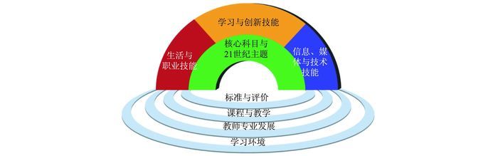 (三) 关注21世纪职场需要——以美国P21框架为例关注受教育者未来职业发展的需要,在美国颇有渊源。例如,美国劳工部于1990年成立了专门委员会——职场基本技能达成秘书委员会(Secretary’s Commission on Achieving Necessary Skills,简称SCANS),以探寻和确立青年人在职场中获得成功所必须的技能。1991年,该委员会发表了《职场对学校教育的要求》(What Work Requires of Schools),提出美国职场基本技能的五大指标(U.S. Department of Labor,1991)。2002年美国正式启动21世纪核心技能研究项目,创建美国21世纪技能联盟(Partnership for 21st Century Skills,简称:P21),努力探寻那些可以让学生在21世纪获得成功的技能,建立21世纪技能框架体系,在世界范围内产生了广泛影响。