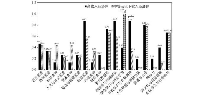 图 4 不同收入水平经济体对核心素养关注度的对比图 (图中纵坐标代表两类经济体对素养的关注度, 即收录这个素养的经济体的数目与该类经济体个数的比值。“*”代表统计检验的显著性水平为P<0.05,“**”代表统计检验的显著性水平为P<0.01。) |