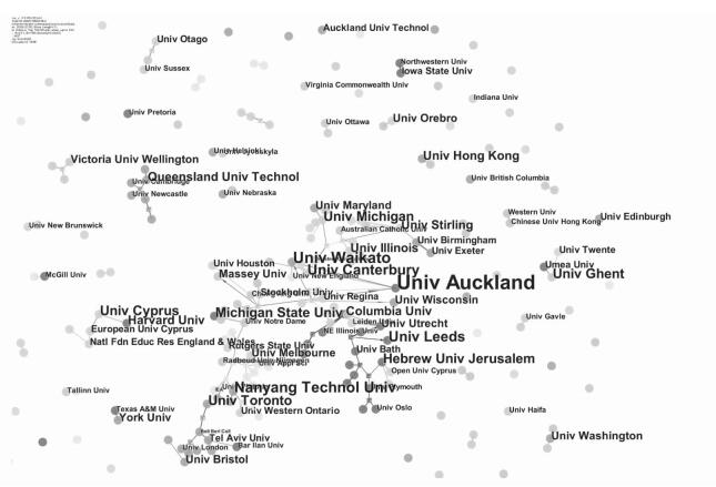 二、研究结果与分析 (一) 课程研究的国家与机构分布根据各论文作者来源国家的数据,我们可以借助Citespace III和Excel分别绘制出图 1和图 2两幅图表。通过观察这两幅图以及其他一些相关的数据表,我们会首先了解到以课程为主题的论文发表数量逐年保持在稳定的状态,大约在30-50篇之间,2011-2013和《课程研究期刊》则分别是论文发表数量最多的年份和学术刊物。其次从国别的差异来看,以美国、加拿大、英国为代表的西方国家始终是课程研究的主力军,光是美国一国就占了全部论文发表数量的三成(30.457%),且与其他国家之间的合作最多(图 2中的连线),其代表性机构有密歇根州立大学、哥伦比亚大学、哈佛大学、伊利诺伊大学等。但是也应该看到,课程研究的国际辐射范围还是非常广阔的,来自北美、欧洲、大洋洲、非洲和亚洲的作者都发表了数量可观的论文。其中大洋洲以澳大利亚和新西兰为代表,两国论文发表的总数甚至达到了20.05%,其中奥克兰大学和怀卡托大学成为发表课程论文最多的机构(图 2中黑色字体最大者);非洲的南非,亚洲的以色列(希伯来大学、海法大学)、中国、新加坡(南洋理工大学)、韩国(延世大学)和日本(创价大学)等也都有出色的表现,特别是中国课程学者(主要是来自香港大学、香港中文大学、首都师范大学等机构)的贡献率排在了前十名,在亚洲学术圈里已经开始扮演起领头羊的角色,证明我国课程研究的国际化已经取得了一定成果。