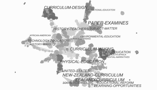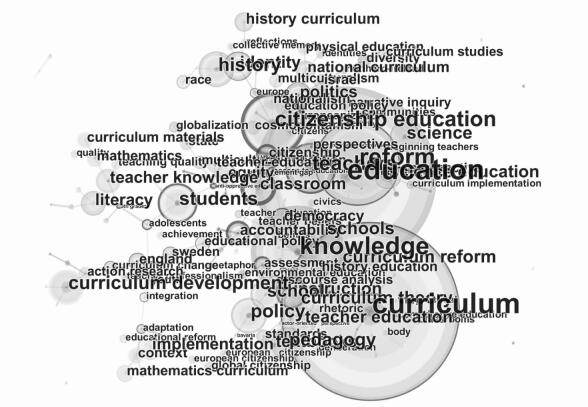 由图 3显示最大的十个节点分别为知识、改革、公民教育、教师、学生、历史、教学、政策、课程开发、课程改革,它们都是在样本数据中共现频率达到10次以上的关键词。在上述议题中,关于知识(特别是教师知识)的研究是最大的热点,例如揭示教师在课程设计、学科教学法和课程连续性方面的知识匮乏,因此亟待外部课程专业人士提供更有效的支持(Huizinga, Handelzalts & Nieveen, 2014)。以分数为例,揭示教师在职前培训时未能形成适宜的学科内容知识,因此建议教师教育的实施者能够从学生学习学科知识的角度重新审视以及改革职前课程,以提高教学的有效性(Steenbrugge, Lesage & Valcke,2014)。但是与这些具有“瑕疵取向”的研究所不同的是,另一些论文却强调教师在课程开发乃至整个改革过程中的能动性及其积极影响,例如有文章从忠实和行动者取向两个视角呈现了教师在课程实施过程中的复杂情形,表明教师一方面会根据课程方案的目标与结构进行自我调适,但在更多的情况下却会做出自己的诠释和解读,从而形成不同的教学风格(Penuel, Phillips & Harris, 2014)。希尔福蒂的研究则表明学科教师会自愿组成或加入到专业协会中,对与学科相关的课程政策进行批判性审视并贡献自己的力量,而这就是教师专业主义的外在表现(Hilferty, 2007)。