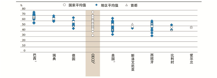 国家的人力资本通常聚集在首都地区在一些国家,首都地区占有国家相当数量的人口、技术熟练劳动力和财富。例如,斯德哥尔摩 (瑞典首都) 地区占国家24%的人口、32%的GDP和29%的受过高等教育的劳动力;同样,马德里 (西班牙首都) 占国家14%的人口、19%的GDP和19%的受过高等教育的劳动力 (OECD,2016)。巴西、德国和美国正好与之相反,除首都之外还有其他很多地区,它们的人口比重更高,受过高等教育的成人比例更大,经济活力也更强。