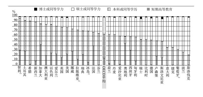 取得硕士或博士学历的高等教育毕业生的比例在不同国家各不相同在OECD国家中,41%的25-34岁青年接受过高等教育,但是这一数字在各国之间差距很大,在意大利是24%,而在韩国则高达68%。此外,高等教育毕业生取得的学历类型也存在很大差异。平均而言,25-34岁的高等教育毕业生中有15%的人最高学历为短期高等教育学历,49%拥有本科学历或同等学力,35%拥有硕士学历或同等学力,博士学历或同等学力取得者的比例为2%。但在波兰和斯洛伐克,超过70%的25-34岁高等教育毕业生取得了硕士及硕士以上学历或同等学力,在智利、希腊和土耳其,这一比例不足10%(图 1)。在意大利、波兰和瑞士,短期高等教育学历获得者在受过高等教育的青年中所占的比例不足0.5%,但是在奥地利、加拿大和法国,这一比例则高达40%或以上。