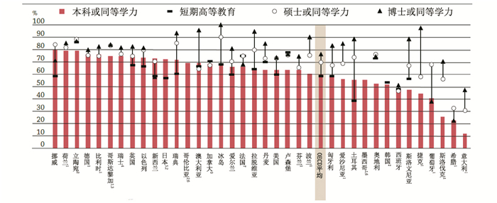 基本要点:高等教育学历层次的分布在不同OECD国家和国家内部不同的年龄段之间都会有很大的差异。在25-34岁的年轻人之中,博士毕业生的就业率高于其他学历层次的高等教育毕业生,但本科和硕士毕业生的就业率并不总是高于短期高等教育项目的毕业生。这表明,不论高等教育学历层次的分布情况如何,各国都需要确保其高等教育体系所颁发的文凭证书能够得到劳务市场的认可。