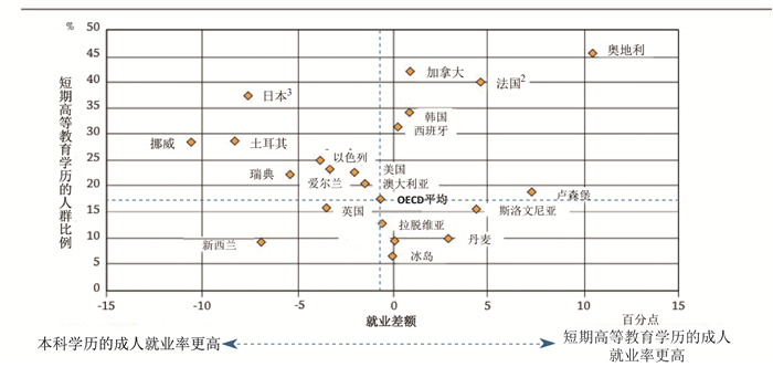 图 3 25-34岁间最高获短期高等教育学历的毕业生比例及他们与本科学历获得者相比所得的就业差额1