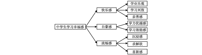 从历史发展的角度看,人们对幸福感的关注会随着人类社会生产力发展水平和组织结构的变迁而有不同侧重。具体地说,从“享乐主义”到二战后发达国家所关注的以生活满意度为主要成分的“主观幸福感”理论,再到20世纪中期兴起的积极心理学中的“心流理论”(又称“流畅感”或“沉浸感”理论),它们所关注的幸福感的侧重点依次为“快乐感”、“自豪感”和“流畅感”。本研究基于上述时间轴线,结合中学生学习的空间区域和学习领域特征构建学习幸福感的维度及其下属因子,形成中学生学习幸福感结构模型的理论构想。主要包括:(1) 基于享乐主义或快乐主义的“快乐感”,除了包括“学业乐观”、“学习兴致”外,还包括“亲善感”,因为对周围环境中的人和事感到亲切友善也能增强一个人的快乐感;(2) 基于主观幸福感理论、社会比较理论以及自我效能感理论的“自豪感”,涵盖学力优越感和学习效能感两个因子;(3) 基于希斯赞特米哈伊1975年首次提出的流畅 (Flow) 理论的“流畅感”,其最核心的成分为沉浸体验 (感)。希斯赞特米哈伊研究发现,最容易产生流畅体验的日常活动是基于个人对新鲜事物的兴趣爱好 (Csikszentmihalyi M.,1997);Scheier等人 (1985)也发现,乐观的人在面对困难时,会坚持不懈沉浸其中。因此我们把喜新感和求解欲也作为流畅感的下属因子 (见图 1)。