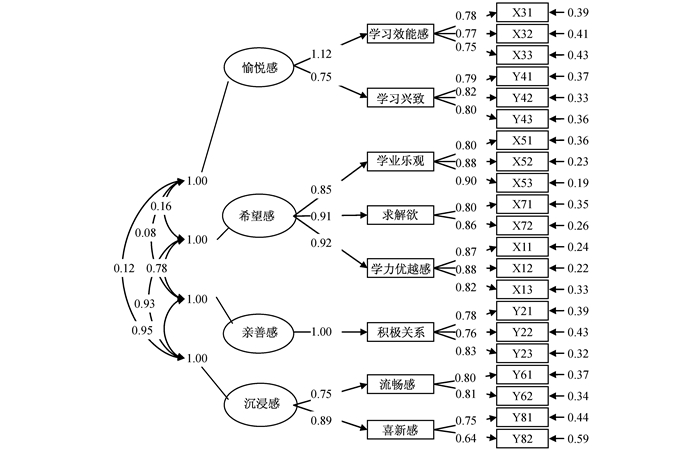 五、 研究结论(一) 中学生学习幸福感的结构为由学习兴致与学习效能感构成的愉悦感,学力优越感、学业乐观和求解欲构成的希望感,积极关系构成的亲善感,以及喜新感与流畅感构成的沉浸感所组成的8因子4维度的二阶模型。