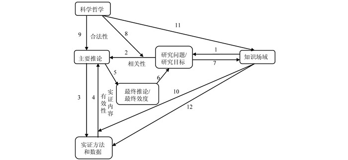 为弥补因果推论的不足,明确教育实证研究的推论过程如何依赖环境,研究者Lund提出了教育实证研究的推理元模型 (A metamodel of inferences)(见图 1)(Lund,2005)。推理元模型的核心是主要推论 (main inferences) 及其三个主要属性 (相关性、合法性和有效性)。主要推论包括统计推断、因果推理、结构推理 (construct inferences) 和归纳推理 (generalisations);主要推论的相关性 (重要性或优先性) 取决于研究问题/研究目标 (箭头2) 和科学哲学 (箭头8);主要推论的合法性取决于科学哲学 (箭头9);主要推论的有效性取决于实证研究的方法、数据 (箭头4) 和知识场域 (knowledge space)(箭头10)。蕴含研究问题/研究目标的主要推论影响着实证方法的选择 (箭头3)。实证方法和数据不仅决定了有效性,还为主要推论提供实证内容 (箭头4)。知识场域包括一系列实质性的、方法论的知识,在其他研究中建构的标准、实质性理论 (substantive theories) 和方法论模型等,其作用非同一般:知识场域是研究问题的选择依据 (箭头1);知识场域影响着实证方法的选择 (箭头12);知识场域的范围被从研究中获得的知识所扩展 (箭头7);知识场域的基本意义源于哲学科学 (箭头11)。最终推论 (final inferences) 及其有效性不仅取决于主要推论及其有效性 (箭头5),而且决定了研究问题的解答 (箭头6)。