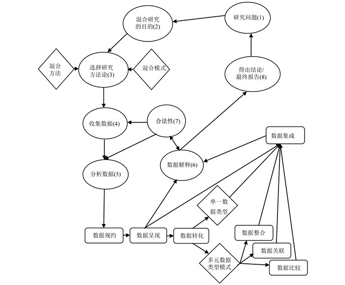 混合方法研究的过程可概括为八个步骤 (见图 2):(1) 确定研究问题;(2) 确定混合方法研究设计是否合适;(3) 选择混合方法 (mixed-method) 或混合模型 (mixed-model) 研究设计;(4) 收集数据;(5) 分析数据;(6) 解释数据;(7) 合法化数据 (legitimate the data);(8) 得出结论和撰写研究报告。当然,这些步骤并非一成不变,而是一个循环的、互动的过程 (Johnson,Onwuegbuzie,2004)。