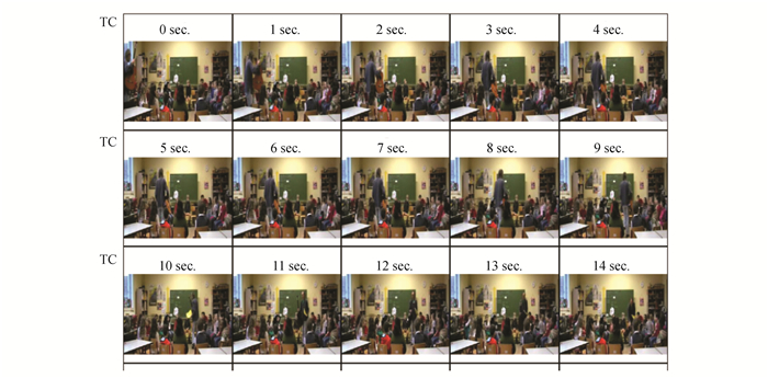 基于对话语序列的认识,波萨克认为日常互动行为也存在着这种序列交互性,尤其在特定的机构(如学校、医院等)当中,我们的行为总是按照规定的框架行事,且相互回应。因此,他认为所选择的片段一定要具有“完整性”(Gestalt)和相对的封闭性。因此诸如视频序幕、结尾、仪式化互动,甚至一些过渡性片段都是他主要的分析蓝本。他把这些选取好的一个片段命名为一个序列(Sequenz)。在教育研究当中,这种序列常常十分明显,也容易把握。我们可以把师生如何开始一堂课程、问题互动、冲突解决、过渡性仪式以及如何结束一堂课等看作不同的序列,并对其中的某类序列,进行连续性地比较分析。譬如,笔者曾就德国小学中一种常见的师生互动实践——晨圈仪式,开展过相关的研究,其中涉及到这样一些问题,即在互动中老师与学生各自扮演着怎样的角色,是否存在一人多角色,角色的成功转化如何通过实践行为显性化等等。这样我们的第一个观察点即“老师/学生如何登场”,因为此类片段不仅能展示个体如何寻找自己在班级群体中的位置,也能体现个体的自我认定在实践中展开的过程。以下片段图像,就是笔者所选择的一个完整的序列图像。在此我们以手抱吉他的斯纳登老师“进入”到视频那一刻为始,以老师最终找到座位入坐为终(图像序列以秒为单位,呈现如图 3)。