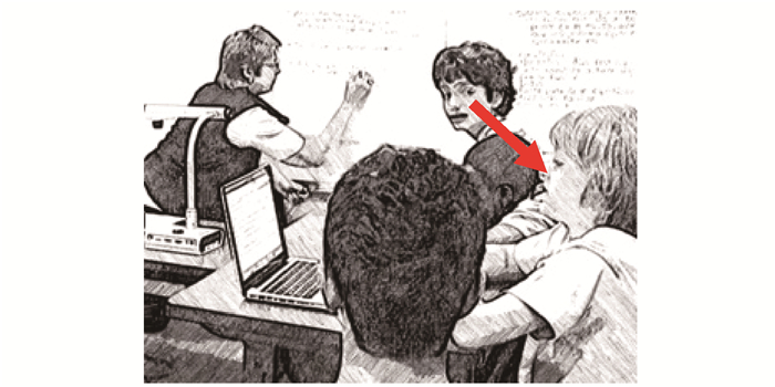 我们首先来分析教师被说服的证据,这一证据反映出语言、身体和物件之间的复杂互动和共时(synchronization)(Goodwin & Goodwin,1996)。在整段互动初始,卢克第一次插话(“被压缩了”)时,教师完全没有望向他(图 3)。当卢克继续发言时,教师的眼神扫向他(图 7),但迅速移向了首先提出质疑的乔(图 8),然后又移向了试图反驳的马特(图 9和图 10)。在语言上,教师仅仅是从班级管理的角度说“你们不能全都同时说话”,而完全没有回应卢克的观点本身。随后,当卢克再次插入对话,并说了两段很长的话时,教师对他做出了直接的肯定回应(“好的,所以”)。然后,教师用手掌指向白板上已有的内容,望向卢克,并说“所以它就导致了”,这是在用语言和身体同时“引用”已有的证据,从而进一步肯定了卢克的观点。最后,教师继续两次作出肯定回应(“好的”“好的”),并转向白板,准备记下卢克的观点,这一举动正式、公开地确立了卢克观点的合法性。